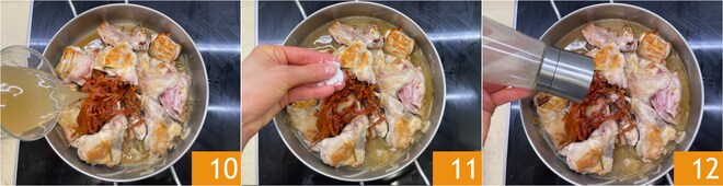 Despeje o caldo na panela 10, ajuste o sal 11 e a pimenta 12.