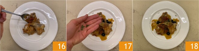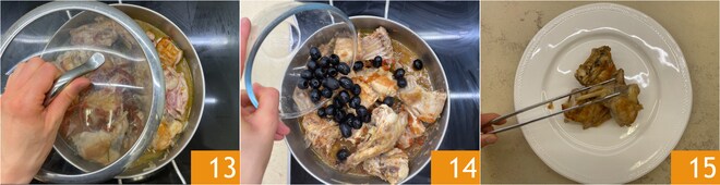 Misture, cubra com uma tampa 13 e cozinhe em fogo baixo por cerca de 40 minutos ou até que o coelho esteja macio; se necessário, você pode adicionar mais caldo durante o cozimento. Nos últimos 5 minutos de cozimento, adicione as azeitonas 14 e misture uma última vez. Sirva 15.