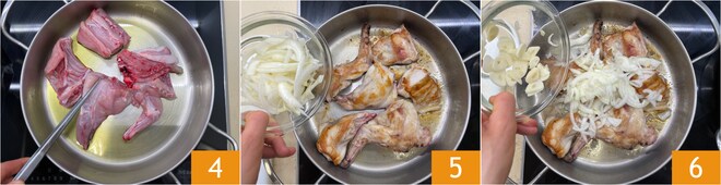 Em uma panela, aqueça o azeite e adicione o coelho 4. Doure em fogo médio de todos os lados até ficar dourado, cerca de 5-10 minutos. Em seguida, adicione a cebola 5 e o alho 6.