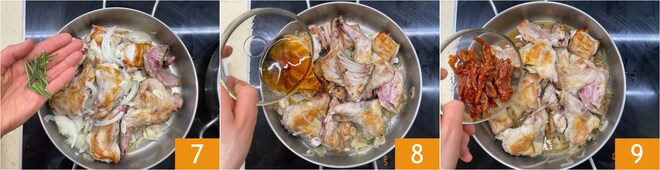 Complete com um pouco do caldo de cozimento 16 e alecrim picado 17. O coelho ensopado com tomates secos está pronto para ser servido quente 18.
