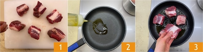 Para preparar a costela bovina assada com purê, comece pela carne, que requer um longo cozimento: salgue a costela já cortada em pedaços 1. Em uma frigideira, aqueça um fio de azeite de oliva 2, depois coloque os pedaços de carne 3.