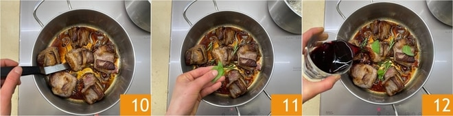 Coloque novamente a costela dourada na panela 10 e perfume com as ervas aromáticas frescas 11. Adicione o vinho tinto 12 e deixe o álcool evaporar completamente.
