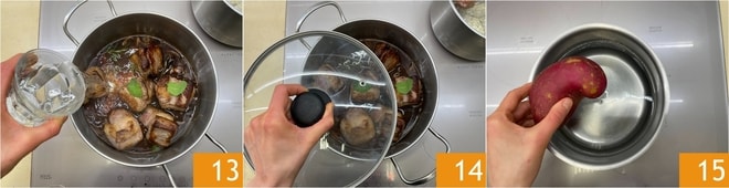 Despeje um copo de água 13, cubra com a tampa 14 e deixe cozinhar por uma hora e meia em fogo baixo, mexendo de vez em quando. Enquanto isso, cozinhe as batatas em água fervente por cerca de 30-40 minutos, ou até que estejam macias 15.