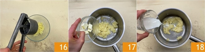 Passe as batatas quentes com a casca no espremedor de batatas 16, depois transfira o purê para uma panela com a manteiga 17 e o leite quente 18.