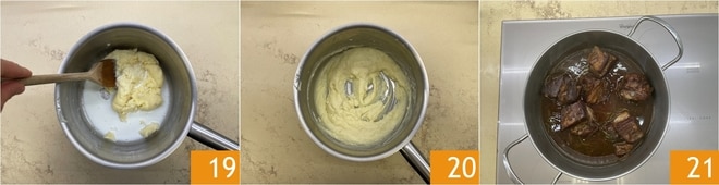 Salgue e misture com uma colher 19 para obter um purê homogêneo e cremoso 20. Enquanto isso, a carne também estará cozida 21.