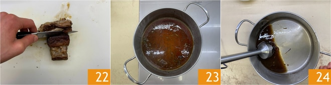 Retire-a da panela e separe a polpa dos ossos 22, reservando o caldo de cozimento 23. Bata o molho com o mixer de imersão 24.