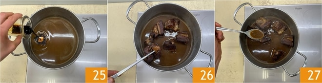 Volte o caldo de cozimento ao fogo, despeje mais 10 ml de vinagre balsâmico 25, adicione a carne reservada 26 e deixe o molho reduzir até engrossar 27. Corrija o sal, se necessário.