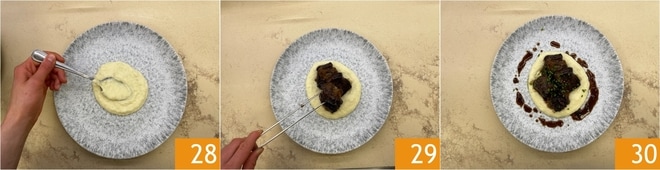 Sirva nos pratos com uma base de purê de batatas 28 sobre a qual colocar os pedaços de carne 29. Complete distribuindo sobre o caldo de cozimento e a cebolinha fresca picada. A costela bovina assada com purê está pronta para ser servida 30!