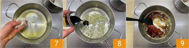 Em uma panela, aqueça outro fio de azeite, adicione a cebola 7 e deixe-a refogar por 3 minutos em fogo baixo, depois adicione 40 ml de vinagre balsâmico 8. Misture para temperar 9.