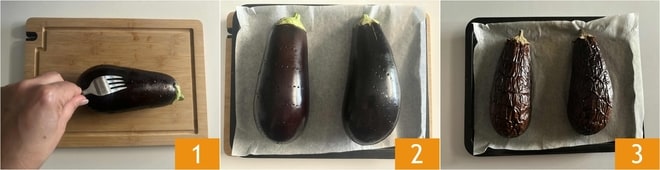 Para preparar o creme de berinjela, lave-as, coloque-as em uma tábua e fure-as com um garfo 1; esta etapa é essencial para evitar que elas explodam durante o cozimento. Uma vez preparadas, transfira-as para uma assadeira coberta com papel manteiga 2, sem adicionar nada. Asse a 200° em modo estático por cerca de 45 minutos, na prateleira central do forno 4.