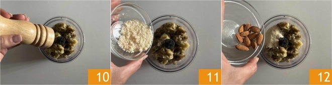 Neste ponto, adicione uma pitada de sal, uma pitada de pimenta 10, o queijo parmesão ralado 11 e as amêndoas 12.