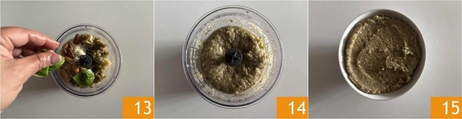 Adicione em seguida o manjericão 13, depois feche o processador e bata tudo até obter um creme homogêneo 14. Transfira para uma tigelinha 15.
