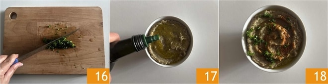 Em seguida, pegue a salsa e pique-a finamente 16. Enriquecer o creme de berinjela com um fio de azeite 17, a salsa picada finamente e uma pitada de pimenta vermelha 18! Sirva imediatamente ou conserve na geladeira!