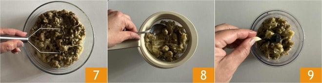 Depois, amasse-as levemente 7 com o utensílio apropriado ou com um garfo. Coloque a polpa das berinjelas em uma peneira com uma tigela embaixo, pressione levemente com uma colher para liberar o excesso de água 8. Transfira para um processador e adicione o dente de alho descascado 9.
