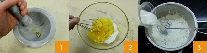 Para preparar o creme catalão de café e cardamomo, comece com o cardamomo: esmague grosseiramente 3-4 bagas de cardamomo em um pilão (se não tiver, pode usar um martelo de cozinha e colocar as bagas entre duas folhas de papel manteiga em cima de uma tábua). Enquanto isso, em uma tigela, adicione as gemas e metade da quantidade de açúcar, trabalhe os ingredientes com o batedor 2 até obter um creme liso e homogêneo. Depois, em uma panela, adicione o leite 3.