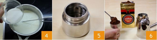 Adicione ao leite a quantidade restante de açúcar 4 e o amido de milho (ou o amido de batata) e comece a aquecê-lo em fogo baixo, mexendo para dissolver o açúcar e o amido de milho. Em seguida, prepare o café na moka: coloque água fria, de preferência pobre em calcário, dentro da caldeira até a válvula de segurança 5 (caso contrário, você obterá um café mais longo). Encha o filtro com o café moído 6.