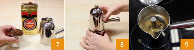 Nivele cada colher de café adicionada batendo o filtro na mesa com movimentos firmes 7, até atingir a borda do filtro. Não pressione com a colher nem faça furos e aperte bem a cafeteira 8 (para evitar que o café saia pelos lados enquanto sobe), então coloque-a em uma chama baixa e constante para obter um café encorpado. À medida que o café sobe, uma espuma densa se formará 9; recomendamos não deixar ferver demais o café para manter intactos o aroma e a doçura.