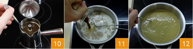 Em seguida, desligue o fogo e seu café para usar na preparação está pronto: misture-o diretamente na moka com uma colher de chá para torná-lo mais homogêneo 10. Adicione ao leite as bagas de cardamomo esmagadas e o café 11, misture 12 e cozinhe em fogo baixo até que a mistura ferva.