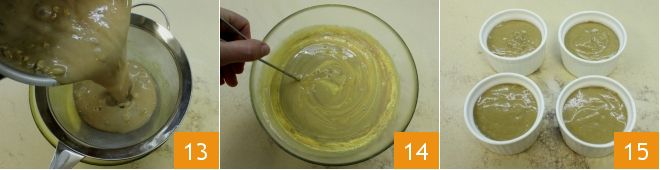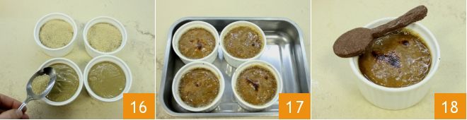 Quando o creme estiver espesso e começando a ferver, desligue o fogo e coe sobre os ovos batidos com o açúcar 13. Misture as misturas 14, depois coloque-as de volta na panela e no fogo por 1 ou 2 minutos, mexendo sempre. Em seguida, preencha 4 cocottes de 160 ml cada com o creme obtido 15 e coloque na geladeira por pelo menos 2 horas.