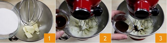 Comece pelas colheres de chá de frolla de café que acompanharão o creme catalão de café e cardamomo: em uma batedeira (ou em uma tigela grande) coloque a manteiga amolecida em pedaços, adicione o açúcar 1 e comece a bater tudo até obter uma mistura espumosa. Em seguida, adicione o café líquido 2 e o em pó 3 e misture bem com as varas.