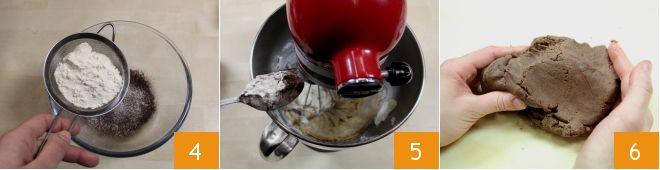 Em uma tigelinha à parte, adicione o cacau em pó e a farinha peneirada 4. Misture e adicione a mistura juntamente com os outros ingredientes na batedeira (ou em uma tigela grande usando uma batedeira elétrica) 5, misture novamente com as varas e depois continue a amassar com o gancho de folha. (Se você não tem o gancho da batedeira, pode terminar de amassar diretamente com as mãos na bancada). Transfira a massa para a bancada e amasse com as mãos até obter uma mistura homogênea e maleável 6.