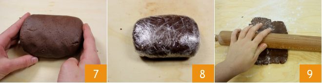 Forme um bloco 7 e cubra-o com filme plástico 8. Coloque-o na geladeira para descansar por pelo menos 2 horas. Após o tempo necessário, estenda a frolla em uma superfície levemente enfarinhada 9 até obter uma espessura de cerca de meio cm.
