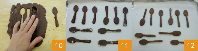 Em seguida, corte 15 colheres de chá 10, amassando e estendendo novamente a frolla até terminar a massa. Coloque as colheres de chá de café em uma assadeira forrada com papel manteiga 11 e asse em forno estático pré-aquecido a 170° por cerca de 20 minutos. Após o tempo necessário, retire do forno 12 e deixe esfriar antes de servir com o creme catalão.