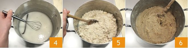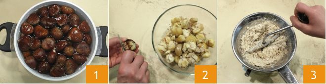 Para preparar a torta com creme de castanhas, comece pela preparação do creme: lave cuidadosamente as castanhas em água corrente. Em seguida, transfira-as para uma panela grande cheia de água e, uma vez atingida a fervura, deixe-as ferver por 15 minutos 1. Após esse tempo, escorra-as e deixe-as esfriar um pouco, em seguida, retire a casca com a ajuda de uma faca afiada 2. Uma vez descascadas, coloque-as em um passa-verduras, até obter uma mistura arenosa 3, como alternativa, você pode usar um espremedor de batatas.