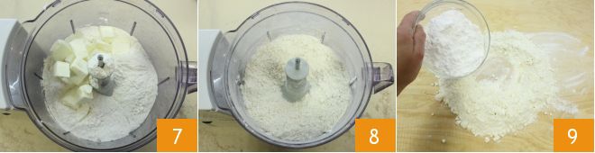 Enquanto o creme de castanhas cozinha, dedique-se à preparação da massa podre: coloque a farinha e a manteiga fria em cubos na tigela de um mixer 7 e bata até obter uma mistura arenosa 8. Em seguida, transfira a “areia” para uma superfície e forme uma cavidade no centro, onde você colocará o açúcar de confeiteiro 9.