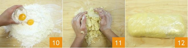 Quebre os ovos, reserve as claras e adicione as gemas à “areia” e ao açúcar 10, misture tudo e trabalhe rapidamente com as mãos 11, para evitar que a massa esquente, até formar uma massa firme e homogênea. Envolva-a em filme plástico e deixe descansar na geladeira por meia hora 12. Para descobrir como prepará-la melhor, consulte a nossa Escola de culinária: Massa podre.