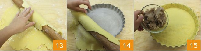 Uma vez preparados o creme de castanhas e a massa podre, basta estender a massa e montar a sua torta. Retire a massa da geladeira, retire o filme e estenda um círculo de massa podre com um rolo 13. Unte e enfarinhe uma forma de 28 cm de diâmetro, depois coloque a massa podre sobre ela 14; para facilitar esta operação, enrole a massa no rolo e depois desenrole-a sobre a forma. Exerça uma leve pressão ao longo do perímetro da forma com o rolo, para eliminar o excesso de massa, por fim, pressione com os dedos para fazer a massa aderir à forma. Em seguida, despeje o creme de castanhas, que no meio tempo terá esfriado 15.