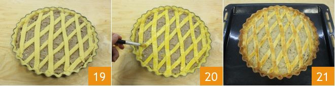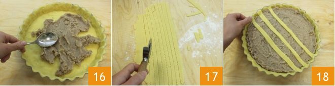 Nivele o creme de castanhas com as costas de uma colher 16, estenda a massa podre restante e corte tiras de massa com um cortador 17, depois disponha-as sobre a superfície da torta, formando os clássicos losangos 18.
