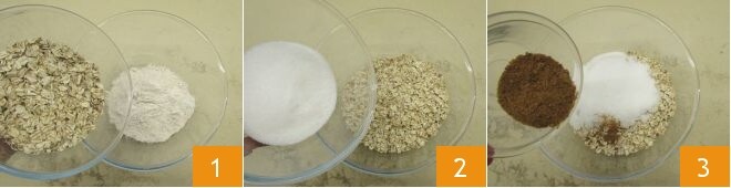 Para preparar a cuca de maçã com flocos de aveia, comece fazendo o crumble: em uma tigela grande, misture a farinha integral, os flocos de aveia 1, o açúcar refinado 2, o açúcar mascavo 3,