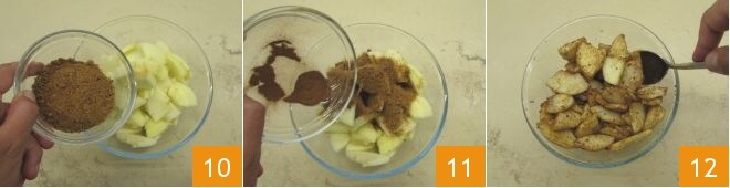 Transfira as maçãs para uma tigela, adicione o açúcar mascavo 10 e a canela 11 e misture com uma colher 12.