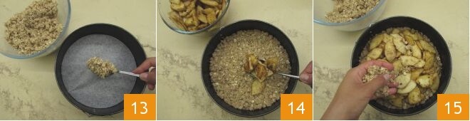 Agora, pegue uma forma de 20 cm de diâmetro, forre o fundo com papel manteiga e despeje metade da massa do crumble dentro 13: tente criar uma camada uniforme compactando levemente a massa com os dedos. Distribua o recheio sobre a base, deixando um espaço livre de 1 cm ao longo da borda 14, depois cubra tudo com o crumble restante 15.