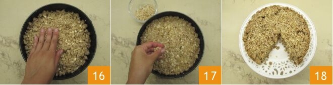 Compacte a superfície com os dedos 16 e polvilhe com a granola de avelã 17, depois asse em forno estático pré-aquecido a 180°C por cerca de 35 minutos. Uma vez assada, retire a sua cuca de maçã com flocos de aveia do forno e deixe esfriar completamente antes de saboreá-la 18!