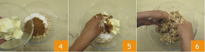 a manteiga fria em cubos 4 e uma pitada de sal. Misture tudo rapidamente com a ponta dos dedos 5 até obter uma mistura esfarelada 6. Coloque a massa na geladeira e deixe-a descansar por cerca de 30 minutos.