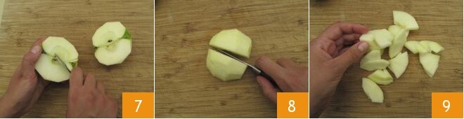 Passe para a preparação do recheio: descasque as maçãs, divida-as ao meio e remova o miolo 7, depois corte-as em gomos 8 e, por fim, em fatias finas 9.
