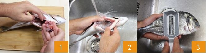 Para preparar a dourada na frigideira, primeiramente cuide da limpeza do peixe (caso contrário, se você comprar já eviscerada, o peso deverá estar em torno de 400 g cada uma): faça um corte no ventre com a tesoura e remova as vísceras com as mãos 1, em seguida enxágue cuidadosamente o interior sob água corrente 2 e remova as escamas usando um descamador ou a lâmina de uma faca; faça essa operação sob água corrente ou dentro de um saco plástico para não espalhar escamas por aí 3. Para mais detalhes sobre o procedimento, consulte nossa escola de culinária "Como limpar a dourada".