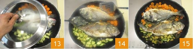 Cubra a frigideira com uma tampa 13 e cozinhe em fogo médio por 7 minutos, em seguida vire as douradas com a ajuda de 2 espátulas, prestando atenção para não quebrá-las 14; cubra novamente com a tampa e cozinhe por mais 7 minutos 15. Os tempos de cozimento, obviamente, podem variar de acordo com o peso da dourada que você utilizar. A dourada na frigideira está pronta para ser servida!
