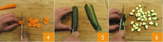 Agora passe para o corte dos legumes: lave e descasque as cenouras, depois corte as extremidades e corte-as em rodelas de cerca de 5 mm de espessura 4. Lave e corte também as abobrinhas, corte-as ao meio no comprimento e depois divida cada metade novamente 5; por fim, corte-as em cubos de cerca de 1 cm de espessura 6.
