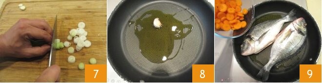Por último, lave o cebolinha, remova a base e corte-o em rodelas de cerca de 5 mm de espessura 7. Despeje o óleo em uma frigideira antiaderente grande, adicione o dente de alho com casca e deixe fritar por um par de minutos 8. Quando o óleo estiver aromatizado, remova o alho da frigideira e coloque as douradas dentro, depois adicione as cenouras 9,