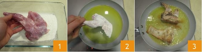 Para realizar o ensopado de coelho agridoce, comece enfarinhando cuidadosamente os pedaços de carne 1, depois doure poucos pedaços por vez em uma panela, onde você terá despejado 8 colheres de sopa de óleo 2. Doure a carne em temperatura média, de modo a selar a superfície. Quando o coelho estiver bem dourado 3 e você tiver terminado todos os pedaços,