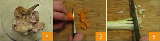 reserve em uma tigela 4. Agora prepare o refogado: descasque e pique a cenoura 5, depois lave e pique o talo de aipo 6.