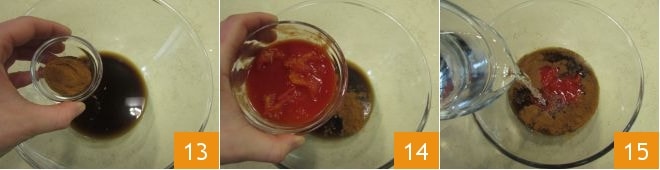 a canela em pó 13, a polpa de tomate 14 e por fim a água 15.