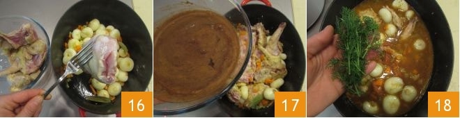 Uma vez que as cebolas estejam douradas, adicione os pedaços de coelho reservados 16, cubra com o molho que você preparou anteriormente 17. Perfume com o funcho fresco 18,