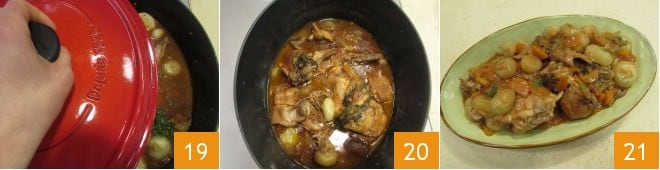 tampe com uma tampa 19 e continue cozinhando por 45 minutos em fogo médio até que o líquido tenha reduzido pelo menos três quartos. Uma vez terminado o cozimento 20, sirva seu ensopado de coelho agridoce bem quente 21.
