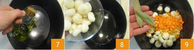 Em uma panela de borda alta, de preferência de ferro fundido, aqueça um fio de óleo de oliva 7, depois adicione as cebolas borettanas 8, o picado para o refogado e as folhas de louro 9. Deixe refogar em fogo baixo por cerca de 10 minutos.