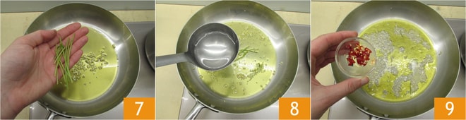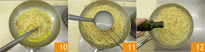 Quando a massa estiver al dente, escorra-a diretamente na frigideira 10. Despeje uma concha de água do cozimento 11, deixe absorver para completar o cozimento e, em seguida, misture com cerca de 40 g de óleo 12. Salteie brevemente o espaguete. Quando estiver quase completamente misturado, ajuste se necessário com sal fino.