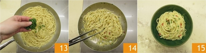 Tempere com a salsinha picada 13, misture 14 e sirva o espaguete alho, óleo e pimenta bem quente 15.